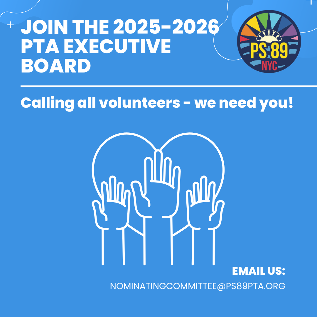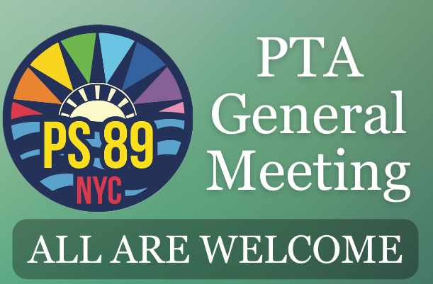 Upcoming Event: PS 89 PTA General Meeting, March 21 Join the PTA General Meeting* in the Cafeteria on Friday, March 21 after drop-off! Enjoy coffee and pastries as you catch up with other PS 89 parents, get important school updates from Principal Ronnie, and hear from the PTA Executive Board about upcoming school events. *Zoom link and meeting agenda will be available on Wednesday, March 19.